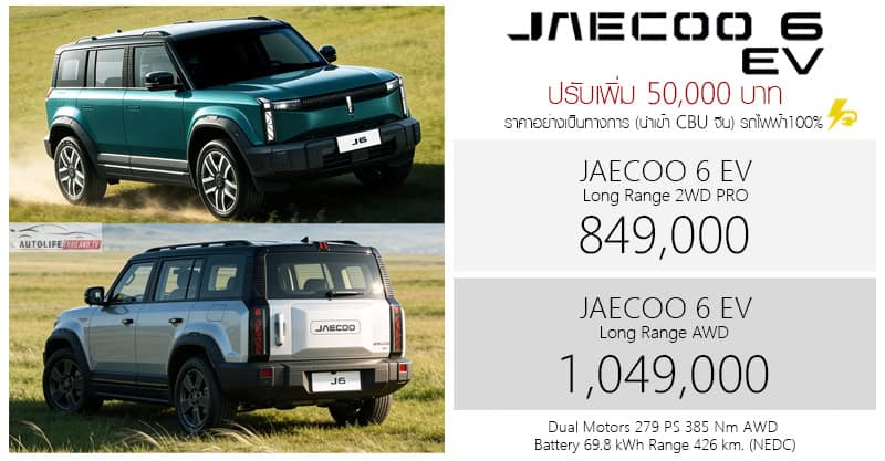 * Jaecoo 6 Long Range 2WD Pro ราคาหลังหักส่วนลด ปี 2025 จาก 799,900 ปรับเพิ่ม 50,000 บาท เป็น 849,000 บาท ในปี 2026 และ Jaecoo 6 Long Range 4WD ราคาหลังหักส่วนลด ปี 2025 จาก 999,000 ปรับเพิ่ม 50,000 บาท เป็น 1,049,000 บาท ในปี 2026 มีผล 5 – 31 มกราคม 2026