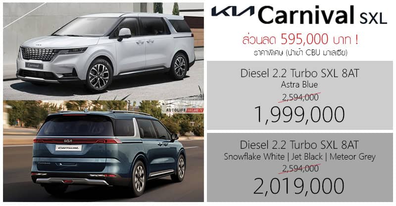ส่วนลด 595,000 ! ราคาพิเศษ KIA Carnival SXL 2.2 DIESEL TURBO : 1,999,000 – 2,019,000 บาท | เบาะ 11 ที่นั่ง