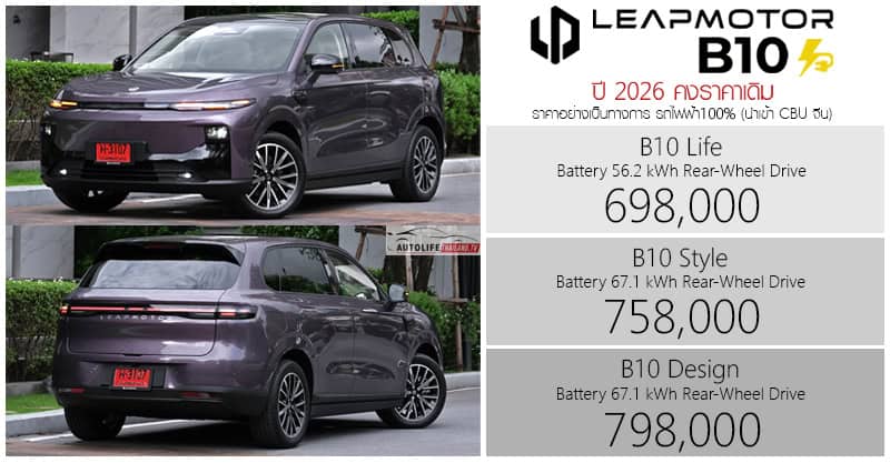 LeapMotor B10 รถไฟฟ้า100% ราคาอย่างเป็นทางการ : 698,000 – 798,000 บาท | คงราคาเดิม ปี 2026