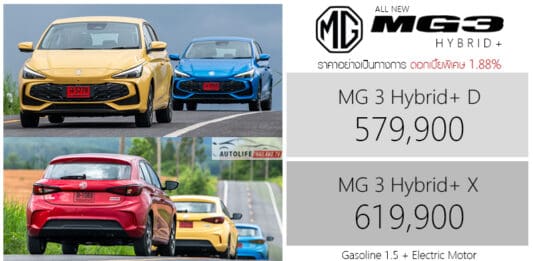 All NEW MG 3 Hybrid+ ราคาอย่างเป็นทางการ MG 3 Hybrid+ D 579,900 บาท MG 3 Hybrid+ X 619,900 บาท มาพร้อมการรับประกันคุณภาพตัวรถ ดังนี้ รับประกันคุณภาพตัวรถ Warranty นาน 5 ปี / 120,000 km. รับประกันแบตเตอรี่ไฮบริด นาน 10 ปี ไม่จำกัดระยะทาง บริการช่วยเหลือฉุกเฉิน Roadside Assistance ตลอด 24 ชั่วโมง ฟรี ชุดพรมปูพื้น ฟรี ประกันภัยชั้น 1 นาน 1 ปี ดอกเบี้ยพิเศษ 1.88% Dimension มิติตัวถัง MG 3 Hybrid+ ยาว … Continue reading ราคาอย่างเป็นทางการ MG 3 Hybrid+ : 579,900 – 619,900 บาท | ดอกเบี้ยพิเศษ 1.88% เบนซิน 1.5 + มอเตอร์ไฟฟ้า 194 แรงม้า