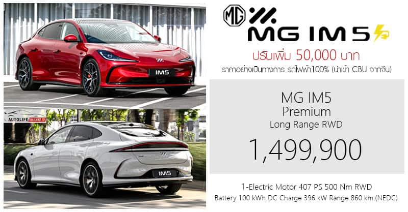ปรับเพิ่ม 50,000 ! MG IM5 รถไฟฟ้า100% ราคาอย่างเป็นทางการ : 1,499,900 บาท | แบต 100 kWh วิ่งระยะ 860 km.