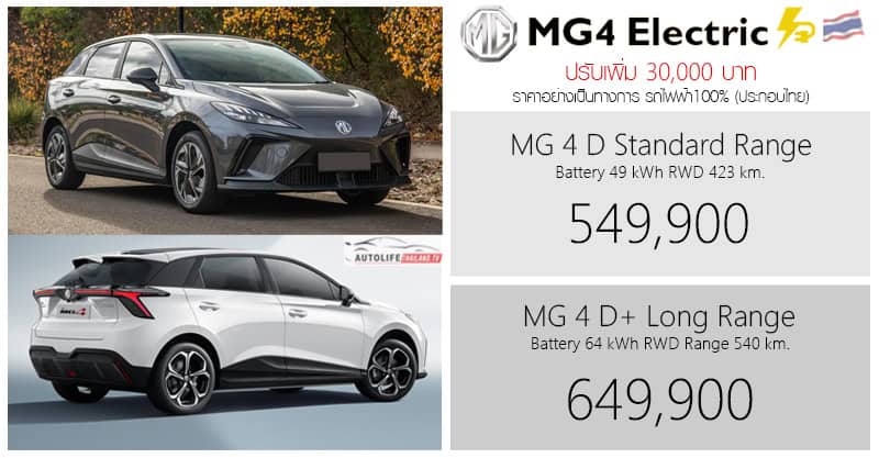 * MG4 D Standard ราคาหลังหักส่วนลด ปี 2025 จาก 519,900 ปรับเพิ่ม 30,000 บาท เป็น 549,900 บาท ในปี 2026 และ MG4 D+ Long Range ราคาหลังหักส่วนลด ปี 2025 จาก 629,900 ปรับเพิ่ม 20,000 บาท เป็น 649,900 บาท ในปี 2026 มีผล 12 มกราคม 2026 เป็นต้นไป