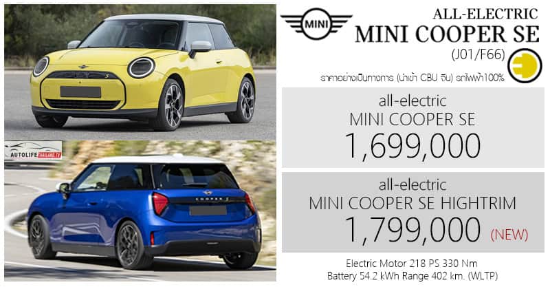 ราคาอย่างเป็นทางการ all-electric MINI Cooper SE รถไฟฟ้า100% : 1,699,000 บาท (นำเข้า CBU จีน) | J01/F66