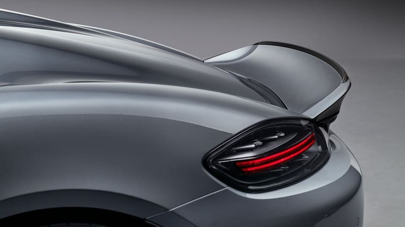 บริเวณมุมกันชนมีส่วนช่วยในการสร้างแรงกด ลิ้นสปอยเลอร์หน้ามีขนาดสั้นกว่าของ Porsche 718 Spyder RS เล็กน้อย ประสานการทำงานกับปีกหลังขนาดใหญ่ สามารถสร้างแรงกดโดยรวมสูงกว่ารุ่น เคย์แมน และเนื่องจากการตัดสินใจเลือกเพิ่มขนาดของลิ้นสปอยเลอร์เพื่อเสริมความสมดุลย์ให้ระบบอากาศพลศาสตร์แทนการใช้ปีก ส่งผลให้รูปทรงของ 718 Spyder RS มีเหลี่ยมมุมที่เฉียบคมในสไตล์ ducktail อุปกรณ์ด้านอากาศพลศาสตร์ทั้งหมดล้วนแล้วแต่ถูกดีไซน์ให้ทำงานร่วมกัน เพื่อวัตถุประสงค์ในการสร้างสมดุลย์ รวมทั้งให้เสถียรภาพสูงสุดขณะขับขี่ด้วยความเร็วสูง