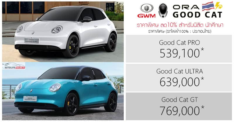 * ส่วนลดพิเศษ สำหรับนิสิต นักศึกษา ลด10% สูงสุดไม่เกิน 60,000 บาท ในรุ่น Good Cat PRO จาก 599,000 เหลือ 539,100 บาท | Good Cat ULTRA จาก 699,000 เหลือ 639,000 บาท | Good Cat GT จาก 829,000 เหลือ 769,000 บาท เมื่อแสดงบัตรประจำตัวนิสิต นักศึกษา โดยจะต้องมีอายุ 18 ปี ขึ้นไป และ บัตรจะต้องไม่หมดอายุ