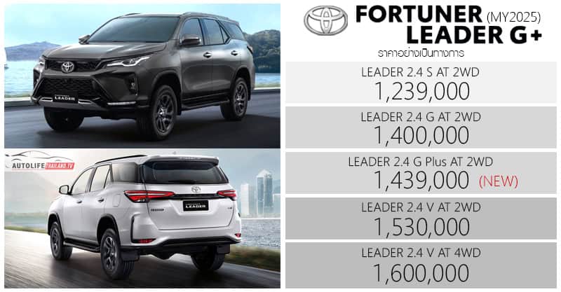 Toyota Fortuner LEADER (MY2025) ราคาอย่างเป็นทางการ : 1,239,000 – 1,600,000 บาท | ปรับอุปกรณ์ เพิ่มรุ่นย่อย G Plus
