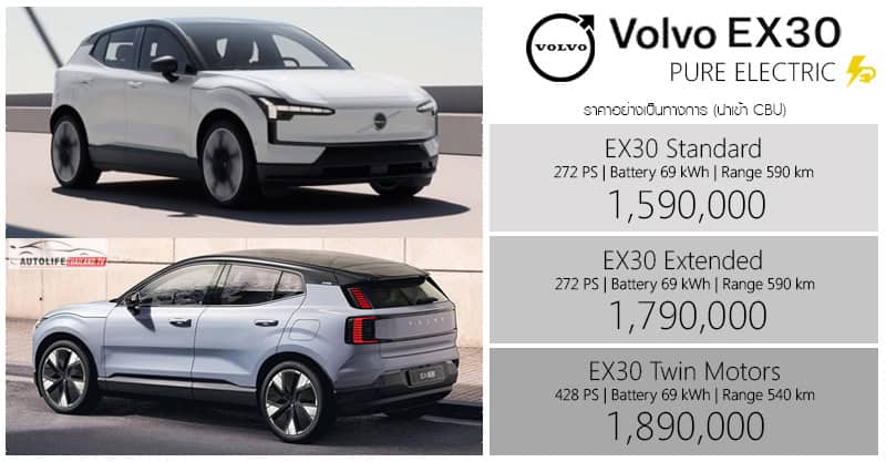 ราคาอย่างเป็นทางการ Volvo EX30 รถไฟฟ้า100% : 1,590,000 – 1,890,000 บาท (นำเข้า CBU) | Extended Range