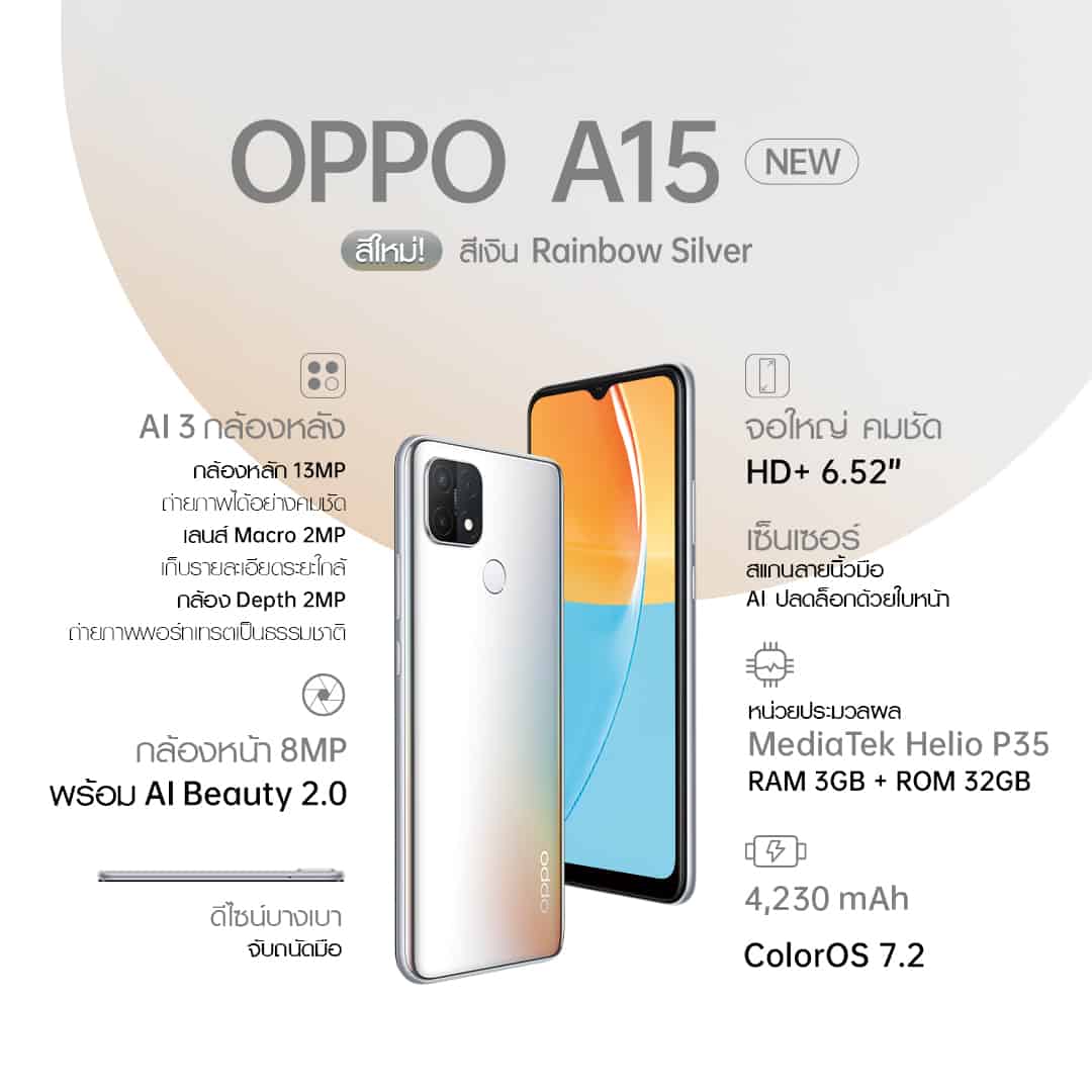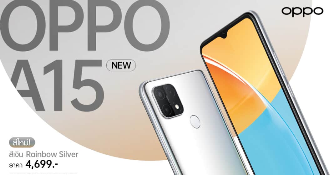 OPPO ประกาศการกลับมาของสมาร์ทโฟนน้องเล็ก OPPO A15 NEW ที่ล่าสุด! มาในสีใหม่ สีเงิน Rainbow Silver สวยสะกดทุกสายตา โดยวางจำหน่ายพร้อมกันทั่วประเทศตั้งแต่วันที่ 20 สิงหาคม 2564 ในราคาเพียง 4,699 บาท เท่านั้น