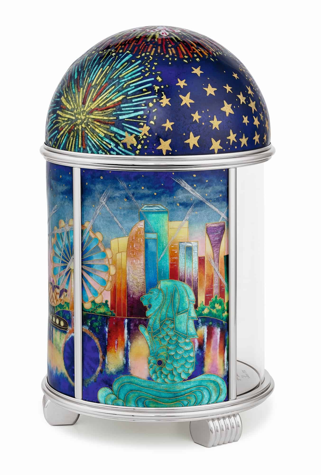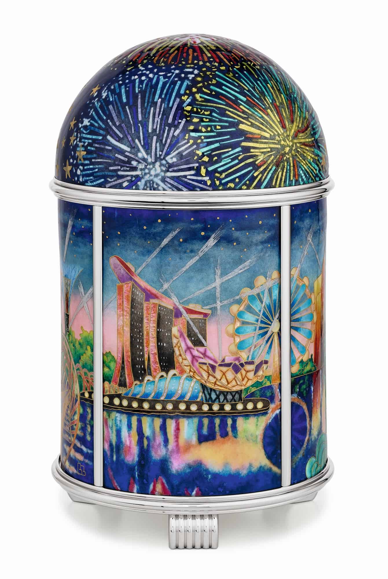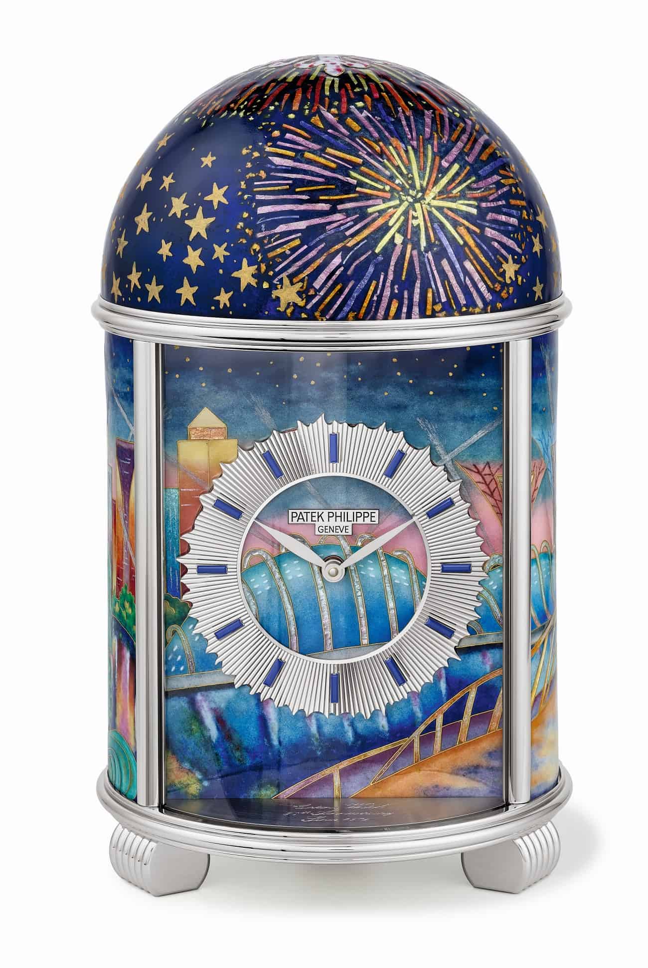สำหรับรุ่นถัดมา Ref. 20145M-001 ‘Singapore Skyline’ นั้นเป็นนาฬิกาตั้งโต๊ะทรงโดมลงยาแบบ Cloisonné enamel หน้าปัดจากโลหะเงินที่เป็นประกายแวววาวและใช้สีทองและสีเงินอย่างสวยงาม ภายใต้แนวคิด ความงดงามของทัศนียภาพของประเทศ สิงคโปร์ ซึ่งมีตัวแมสคอต Merlion ตั้งอยู่ในบริเวณเขตพื้นที่ธุรกิจ มีสวน Gardens by the bay, Esplanade, และ Marina Bay Sands ซึ่งเป็นที่ตั้งร้านบูติก ของ Patek Philippe ที่เปิดเป็นแห่งที่สองในประเทศสิงคโปร์ โดยบริษัท Cortina Watch