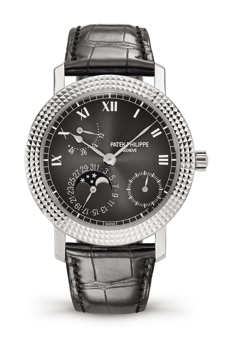 Ref. 5057G-010 Calatrava นี้ เป็นนาฬิกาข้อมือ รุ่น Limited Edition ที่ทำจากทองคำขาว และจะจัดผลิตขึ้นโดยเฉพาะเพื่อใช้ในการเฉลิมฉลอง 50 ปี โดยได้ผลิตขอบตัวเรือนเป็นแบบแกะสลักสามแถว สลักลวดลายแบบหัวตะปูด้วยเทคนิคกิโยเช่ ซึ่งเป็นหนึ่งในเอกลักษณ์ดั้งเดิมที่ Patek Phillip ได้ประดิษฐ์ไว้เพื่อ Cortina Watch ในปี 1997 เพื่อร่วมฉลอง 25 ปีแห่งคู่ค้าทางธุรกิจด้วยกัน ทั้งนี้ความพิเศษของรุ่นนี้ จะมีหน้าปัดเป็นสีเทาเข้ม แรเงาในตัวขอบเรือน และใช้ตัวเลขบอกเวลาแบบโรมันซึ่งเป็นทองขาว และเข็มนาฬิกาบอกเวลาถูกประดิษฐ์ในแบบรูปร่างผลแพร์อย่างสวยงาม