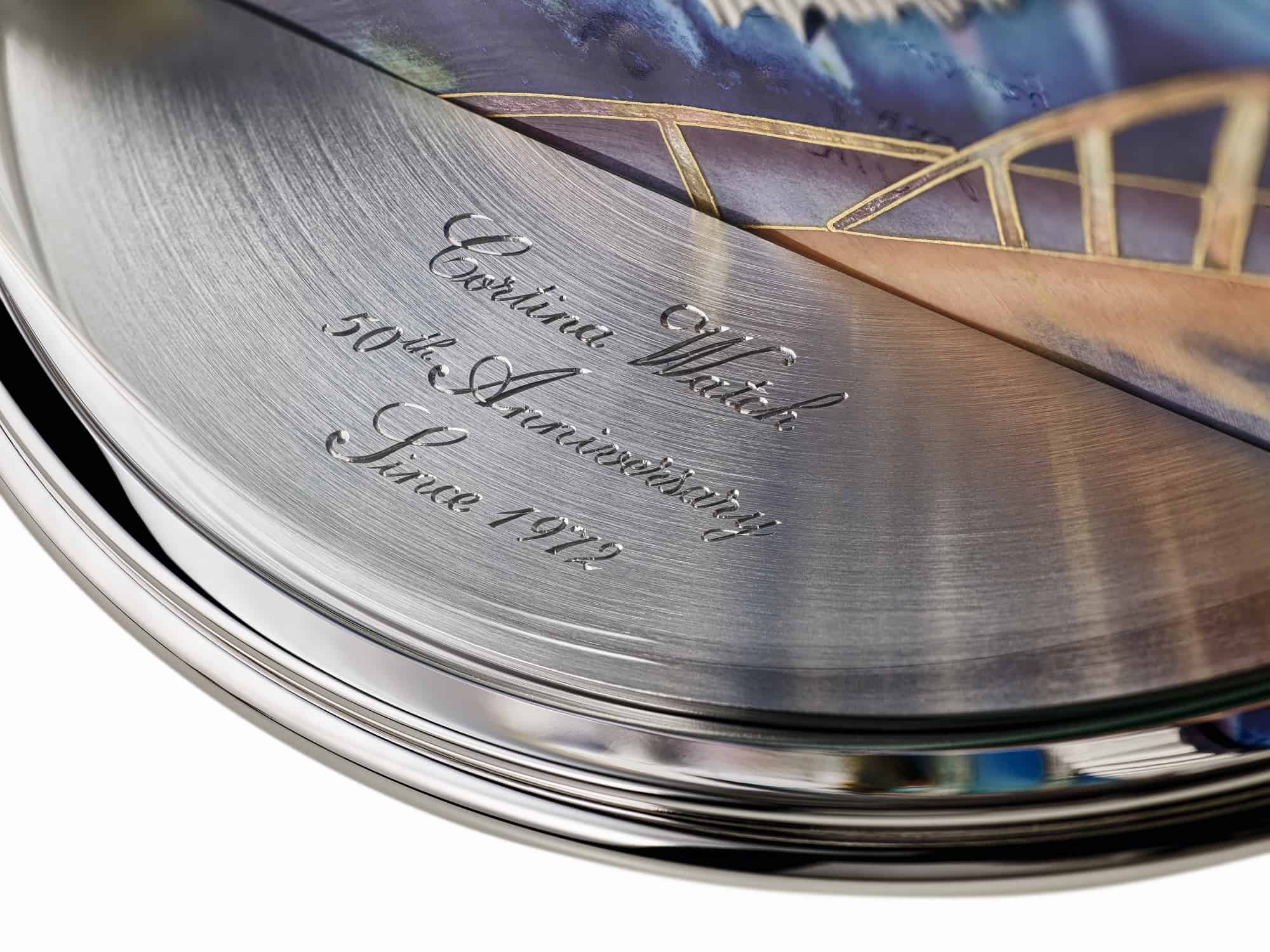 ในการประดิษฐ์รูปร่างขอบฟ้าและรูปอนุสาวรีย์ต่าง ๆ นั้น ช่างเคลือบใข้ ทองคำ 24k ถึง 9.2 เมตร ในการผลิต โดยมีสัดส่วน 0.2 x 0.6 มม. โดยได้ตัดให้เป็นชิ้นส่วนเล็ก ๆ และประดิษฐ์ขึ้นด้วยมือทั้งสิ้น ในการประดิษฐ์รูปภาพด้านหลังมีการจัดแต้มสีต่าง ๆ โดยใช้วิธีการที่ละเอียดอ่อนที่สุดโดยลงสีเป็นชั้น ๆ  ขั้นตอนการลงยา ใช้กว่า 50 สีในการผลิตครั้งนี้มี 47 สีเป็นสีแบบใส และมี 1 สีแบบทึบแสง และอีก 2 สีที่เป็นสีเหลือบ ในการลงยาแต่ละชิ้น จะต้องมีการเผาประมาณ 10-14 ครั้งที่อุณหภูมิสูงระหว่าง 890 ถึง 910  องศาเซลเซียส ในส่วนของดาวและแสงพลุนั้น ได้ประดิษฐ์ไว้ในรูปแบบกระจายตัวของดาวห้าสิบดวงและแสงประกายของพลุไฟ สิ่งเหล่านี้ทำมาจากทองคำและเงินอย่างสวยงาม โดยทำให้เป็นในรูปแบบกระจายทั่วท้องฟ้า เพื่อเป็นสัญลักษณ์การเฉลิมฉลอง 50 ปี ในส่วนของหน้าปัดบอกเวลานั้น ใช้การสลักแบบกิโยเช่ ประดิษฐ์ในรูปแบบหยักเข้าออกเพื่อให้เป็นรูปร่างคล้ายดอกไม้ในสวน โดยจัดเข็มบอกเวลาแบบแนวตรง 12 แท่ง ซึ่งทำมาจาก หิน Lapis Lazuli 2.27 กะรัต โดยวางล้อมหน้าปัดกลางที่ลงยาแบบ cloisonné enamel และมีการแกะสลักชื่อ “Cortina Watch – 50th Anniversary – Since 1972”   นาฬิกาโดมนี้ใช้ Caliber 17 นิ้ว แบบ PEND Mechanical Movement โดยสามารถไขลานโดยใช้มอเตอร์ไฟฟ้า