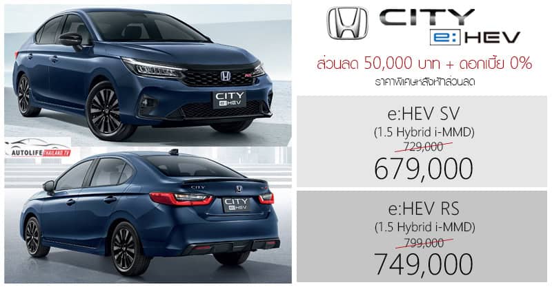 ส่วนลด 50,000 + ดอกเบี้ย 0% ราคาพิเศษ Honda City Sedan e:HEV : 679,000 – 749,000 บาท | พร้อม Ultimate Care