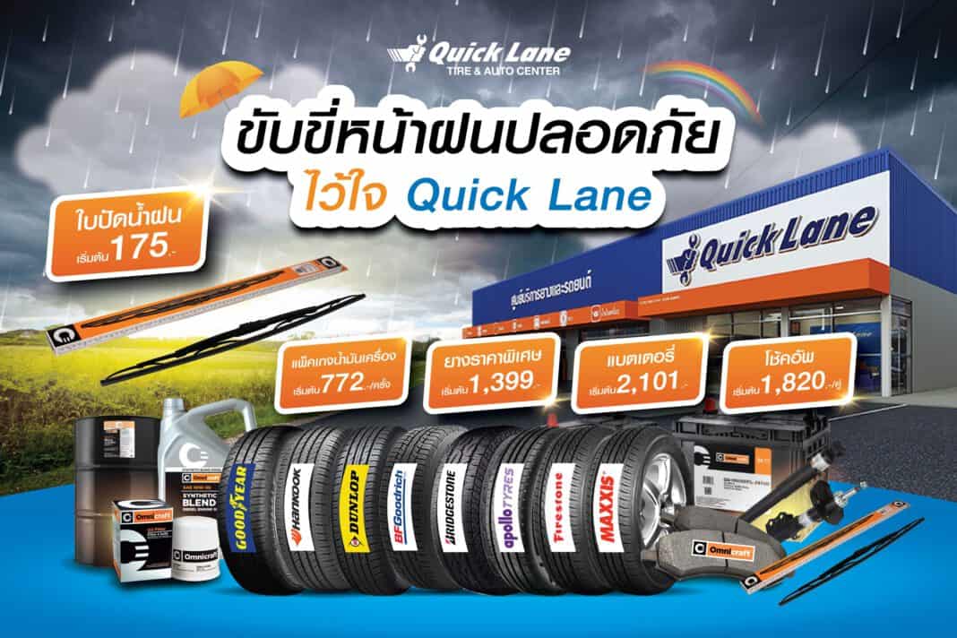 นอกจากนี้ ควิกเลนยังจัดหนักอัดโปรโมชั่นสุดร้อนแรงต้อนรับฤดูฝนในแคมเปญ “ขับขี่หน้าฝนปลอดภัย ไว้ใจควิกเลน” พร้อมโปรโมชั่นยาง “Tyres of The Month” และบริการตรวจเช็กสภาพรถยนต์เบื้องต้นรวม 30 รายการ ซึ่งเป็นการตรวจเช็กระบบต่าง ๆ ของรถยนต์ทุกครั้งที่เข้ารับบริการ เพื่อดูแลลูกค้าให้ได้รับความพึงพอใจสูงสุดในทุกสาขาทั่วประเทศ