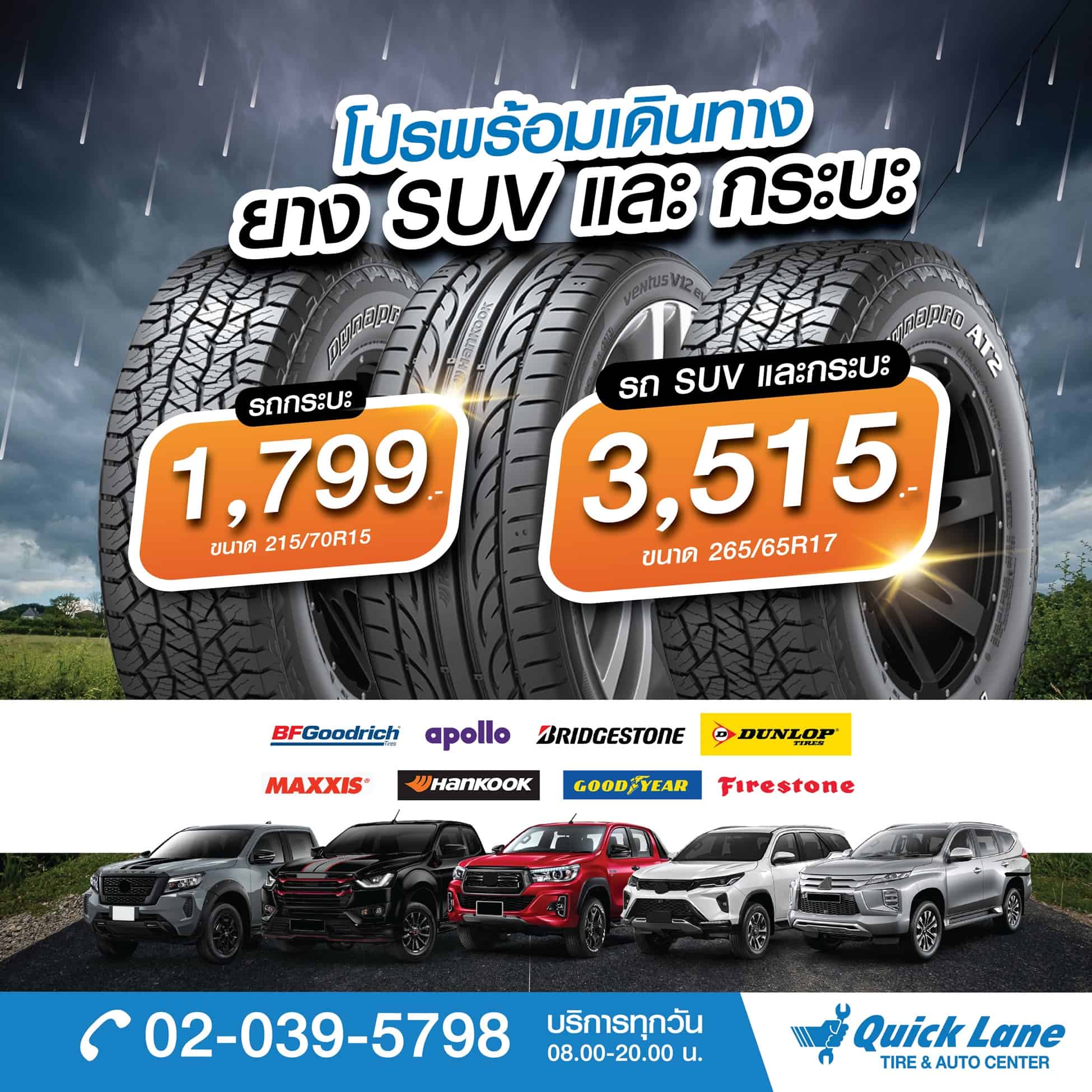- ยาง 265/65R17 เหลือเพียงเส้นละ 3,515 บาท (ปกติ 4,687 บาท) พร้อมโปรโมชั่นซื้อ 3 แถม 1