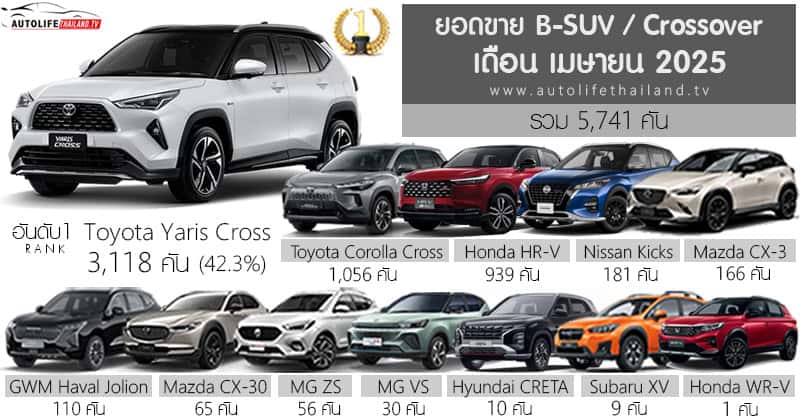 ยอดขาย B-SUV / Crossover เดือน เมษายน 2025 รวม 6,591 คัน : Toyota Yaris CROSS ครองแชมป์