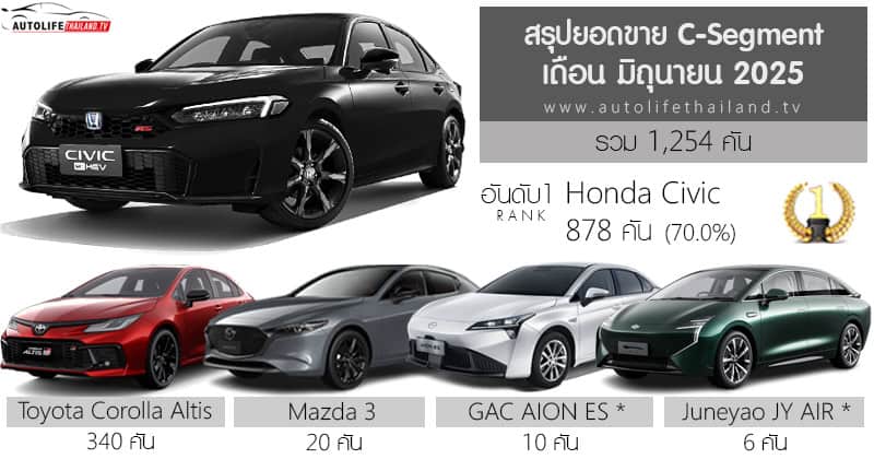 ยอดขาย รถยนต์กลุ่ม C-Segment เดือน มิถุนายน 2568 รวม 1,254 คัน