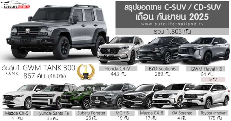ยอดขาย C-SUV / CD-SUV เดือน กันยายน 2025 รวม 1,805 คัน : GWM TANK 300 ครองแชมป์