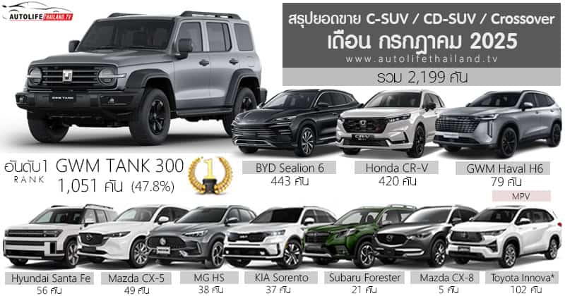 ยอดขาย C-SUV / CD-SUV / Crossover เดือน มิถุนายน 2025 รวม 4,420 คัน : GWM TANK 300 ครองแชมป์