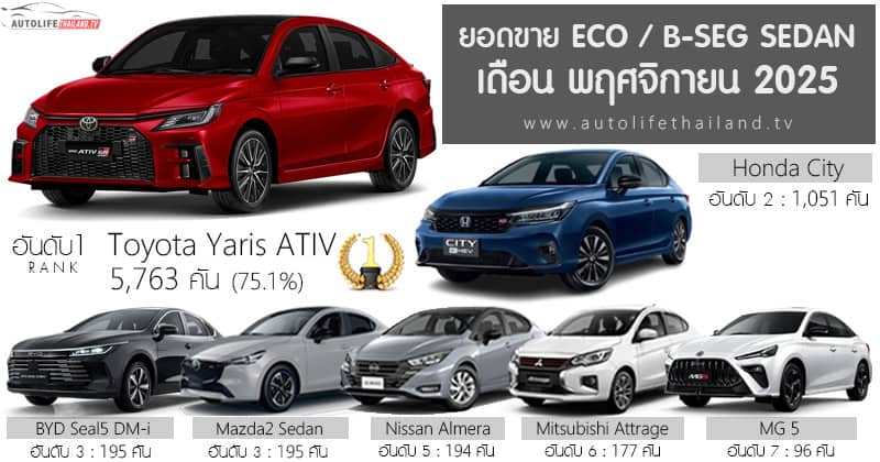ข้อมูลย้อนหลัง : Sales Report ยอดขาย ECO / B-Seg Sedan เดือน ตุลาคม 68 รวม 7,625 คัน :  https://autolifethailand.tv/sales-report-eco-b-seg-sedan-oct-2025/