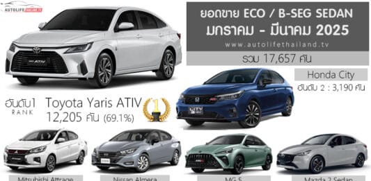Sales Report สรุปยอดขายรถยนต์ กลุ่ม ECO / B-Segment Sedan ไตรมาส 1 ปี 2025 ยอดขายรถยนต์กลุ่ม ECO / B-Segment Sedan เดือน มกราคม – มีนาคม 2568 รวม 17,657 คัน อันดับ 1 Toyota Yaris ATIV : 12,205 คัน ส่วนแบ่งตลาด 69.1% อันดับ 2 Honda City : 3,190 คัน ส่วนแบ่งตลาด 18.1% อันดับ 3 Mitsubishi Attrage : 774 คัน ส่วนแบ่งตลาด 4.4% อันดับ 4 … Continue reading สรุปยอดขาย ไตรมาส1 ปี 2025 (ม.ค.-มี.ค.) กลุ่ม ECO / B-Seg Sedan รวม 17,657 คัน : Toyota Yaris ATIV ครองแชมป์