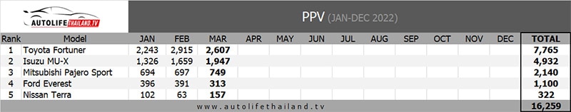 ยอดขายรวม PPV (SUV พื้นฐานกระบะ) เดือน มกราคม – มีนาคม 2022 รวม 16,259 คัน