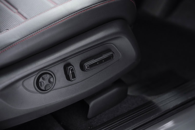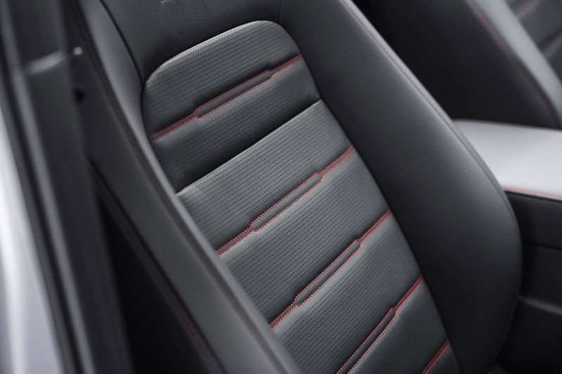 - เบาะนั่งหุ้มด้วยหนังสีดำ ตกแต่งด้วยตะเข็บด้ายสีแดง
