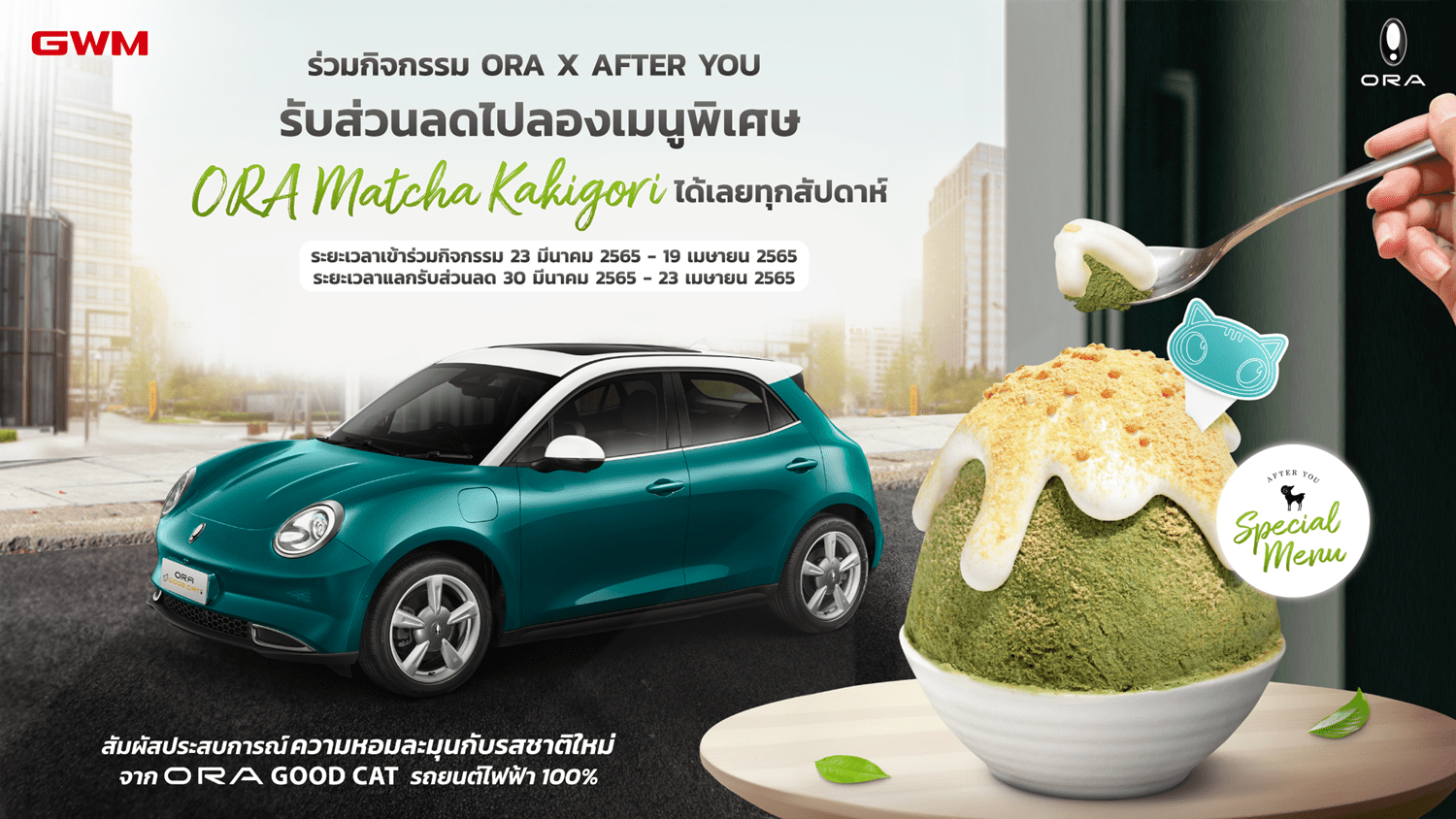 เกรท วอลล์ มอเตอร์ ผู้นำด้านยานยนต์ไฟฟ้าของไทย เดินหน้าสร้างประสบการณ์ใหม่ให้ผู้บริโภคด้วยการจับมือ บริษัท อาฟเตอร์ ยู จำกัด ผู้นำด้านธุรกิจขนมหวานและเครื่องดื่ม เปิดตัวแคมเปญคอลแลบบอเรชันสุดพิเศษ “Special Menu: After You x ORA Good Cat” ที่นำแรงบันดาลใจจากรถยนต์ไฟฟ้า 100% ORA Good Cat มารังสรรค์เป็นเมนูซิกเนเจอร์ “ORA Matcha Kakigori (โอรา มัทฉะ คากิโกริ)” ให้ผู้บริโภคในไทยได้ลิ้มลองที่ร้าน After You ทั้ง 40 สาขาทั่วประเทศ  ตั้งแต่วันนี้จนถึงวันที่ 23 เมษายน 2565 พร้อมรับส่วนลดพิเศษทุกสัปดาห์ผ่านกิจกรรมในแอปพลิเคชัน GWM รวมถึงการทดลองขับที่ GWM Store หรือที่งานบางกอก อินเตอร์เนชั่นแนล มอเตอร์โชว์ ครั้งที่ 43