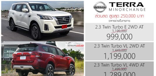 Nissan TERRA Minorchange ราคาอย่างเป็นทางการ 2.3 Twin Turbo E 2WD 7AT 1,199,000 999,000 บาท* 2.3 Twin Turbo VL 2WD 7AT 1,449,000 1,199,000 บาท* 2.3 Twin Turbo VL 4WD 7AT 1,499,000 1,289,000 บาท* * ส่วนลด 200,000 ในรุ่น E 2WD จาก 1,199,000 เหลือ 999,000 บาท | ส่วนลด 250,000 ในรุ่น VL 2WD จาก 1,449,000 เหลือ 1,299,000 บาท | ส่วนลด … Continue reading ส่วนลด ลดราคา 250,000 ! ราคาพิเศษ Nissan TERRA : 999,000 – 1,289,000 บาท | ดีเซล 2.3 Twin Turbo