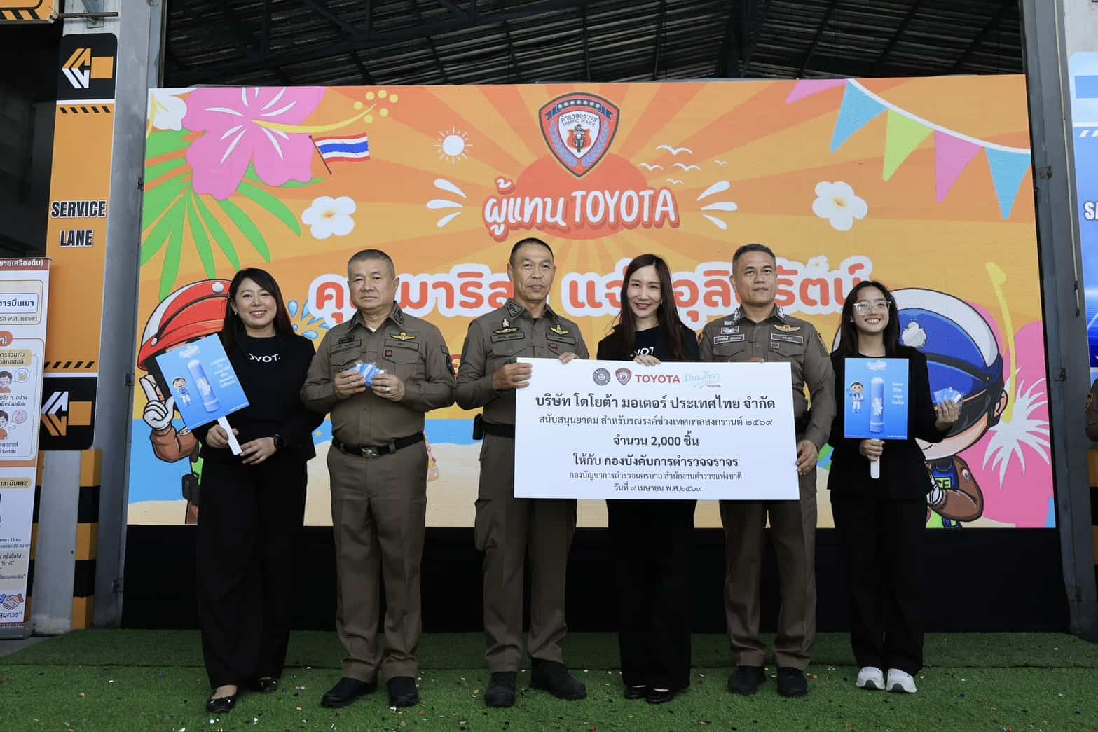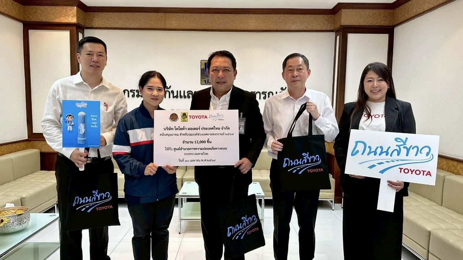 ในช่วงเทศกาลสงกรานต์ปีนี้ โตโยต้าได้ร่วมมือกับ 3 หน่วยงานหลัก ได้แก่ กรมคุมประพฤติกรมป้องกันและบรรเทาสาธารณภัย (ปภ.) และกองบังคับการตำรวจจราจร (บก.จร.) สนับสนุนอุปกรณ์สำหรับกิจกรรมรณรงค์และการตั้งจุดพักรถใน 8 จังหวัดสำคัญทั่วประเทศ ได้แก่ กรุงเทพมหานคร ฉะเชิงเทรา นครราชสีมา ชลบุรี พระนครศรีอยุธยา นครสวรรค์ ราชบุรี และเพชรบุรี โดยมีการมอบยาดมรวม 30,000 ชิ้น เพื่อแจกจ่ายให้ผู้ขับขี่รู้สึกสดชื่น ผ่อนคลายระหว่างการเดินทาง พร้อมเสื้อกั๊กสะท้อนแสงจำนวน 500 ตัว สำหรับอาสาสมัครในพื้นที่ เพื่อเสริมความปลอดภัยตลอดช่วงการเดินทาง