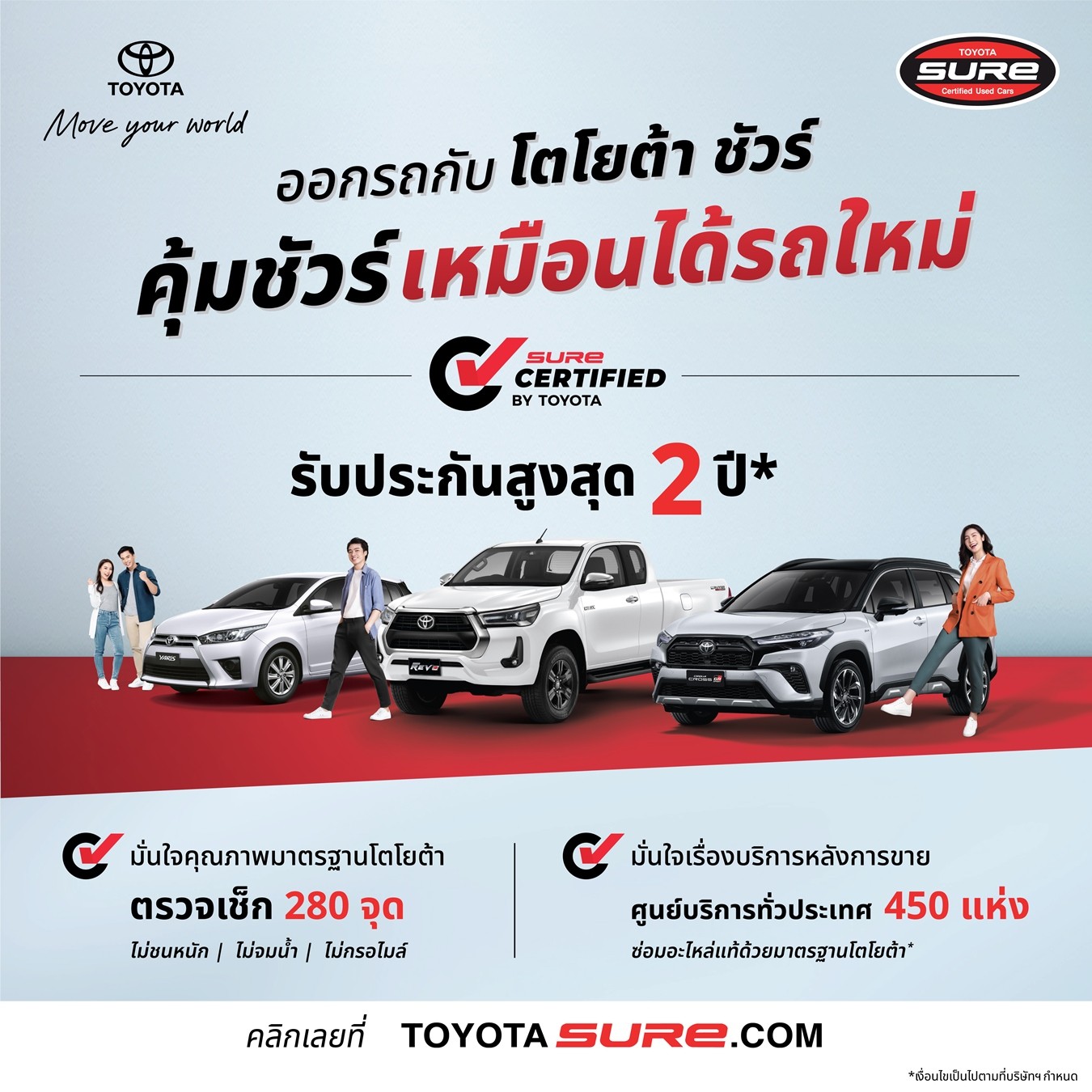 เปิดมิติประสบการณ์ใหม่ของรถมือสอง กับ โตโยต้า ชัวร์ ผู้จำหน่ายรถมือสองอย่างเป็นทางการกว่า 20 ปี นำเสนอผลิตภัณฑ์และการบริการครบวงจรทั้งซื้อ – ขาย และแลกเปลี่ยนรถยนต์ใช้แล้วคุณภาพดีทุกยี่ห้อ ผ่านมาตรฐานการรับรองโดยทีมงานผู้เชี่ยวชาญ และควบคุมมาตรฐานพร้อมดำเนินการภายใต้บริษัท โตโยต้า มอเตอร์ ประเทศไทย จำกัด กับเครือข่ายด้านบริการที่ครอบคลุมทั่วประเทศกว่า 104 โชว์รูม รวมถึงนำเสนอบริการจากบริษัท อ็อคชั่น เอ็กซ์เพรส จำกัด ที่เป็นบริษัทประมูลรถยนต์มือสอง อีกหนึ่งช่องทางในการรองรับรถใช้แล้วของโตโยต้าทุกรุ่น เพื่อความมั่นใจของลูกค้าโตโยต้าในการใช้รถที่มีราคาขายต่อในอนาคตที่น่าพึงพอใจ โดยผู้ที่สนใจ สามารถดูรถคุณภาพดีได้ง่ายๆ ผ่านเว็บไซต์ www.toyotasure.com ที่มีรถให้เลือกกว่า1,700 คัน โดยมีการอัปเดททุกวัน จากผู้จำหน่ายโตโยต้า ชัวร์ ทั่วประเทศ