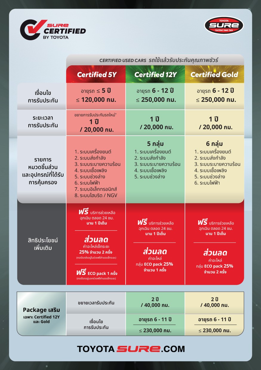 โดยตั้งแต่ 1 มิถุนายน 2567 ที่ผ่านมา Toyota Sure Certified รูปแบบใหม่ขยายการรับประกันที่รับรองคุณภาพรถอายุสูงสุด 12 ปี หรือไมล์ไม่เกิน 250,000 กม.* สูงสุด 2 ปี 40,000 กม. โดยรถทุกคันสามารถเข้ารับบริการ ได้ที่ศูนย์บริการโตโยต้ากว่า 450 แห่ง ทั่วประเทศเช่นเดียวกับรถใหม่โตโยต้า
