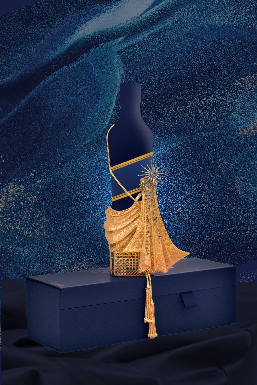 “การเลือกผ้าลายอย่างซึ่งเป็นส่วนประกอบหลักในการสร้างสรรค์ผลงานชิ้นนี้ เป็นผ้าแบบไทยโบราณที่ในสมัยก่อนจะนำมาห่อหุ้มสิ่งสำคัญที่ล้ำค่าเพื่อการเก็บรักษาอย่างดีที่สุด โดยนำมาออกแบบร่วมกับลวดลายดอกไม้เพื่อสร้างทรงของผ้า สะท้อนถึงความตั้งใจที่จะทะนุถนอมและส่งต่อสมบัติอันทรงคุณค่าอย่าง จอห์นนี่ วอล์กเกอร์ บลูเลเบิ้ล จากรุ่นสู่รุ่น โดยเพิ่มความพิเศษด้วยการประดับอัญมณีสีน้ำเงินที่ดีที่สุดจำนวน 100 เม็ด เพื่อร่วมเฉลิมฉลองการครบรอบ 100 ปีแห่งการดำเนินธุรกิจของ จอห์นนี่ วอล์กเกอร์ ในประเทศไทยอีกด้วย”