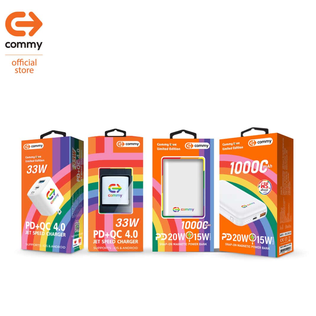 เริ่มต้นฉลองเดือนแห่งความรักด้วย “คอมมี่ เลิฟ ลิมิเต็ด อิดิชั่น” (Commy Love Edition) ของขวัญสุดพิเศษ ที่นอกจากจะมอบความสุขและรอยยิ้มให้กับคนที่รักแล้ว ยังช่วยสนับสนุนและส่งเสริมความหลากหลายทางเพศ (LGBTQ+) เพราะรายได้ส่วนหนึ่งหลังหักค่าใช้จ่ายนำไปมอบให้แก่องค์กรและมูลนิธิเพื่อความเท่าเทียมทางเพศ ประกอบไปด้วย “Snap-on Magnetic Powerbank 10,000 mAh” แบตเตอรี่สำรองชาร์จไร้สาย พกพาสะดวก รองรับความเร็วการชาร์จสูงสุด หรือ Fast Charging มาพร้อมจอ LED แสดงปริมาณแบตเตอรี่ จำหน่ายราคา 2,290 บาท และ “Jet Speed Charger” หัวชาร์จเร็วเต็มสปีด รุ่น AD003PQ จ่ายไฟสูงถึง 33 วัตต์ รองรับระบบ PD + QC 4.0 พร้อมเทคโนโลยี GaN ให้ชาร์จเร็วขึ้นถึง 70% และสามารถชาร์จพร้อมกันได้ถึง 2 อุปกรณ์ ใช้ได้ทั้งระบบ iOS และ Android จำหน่ายราคา 1,099 บาท