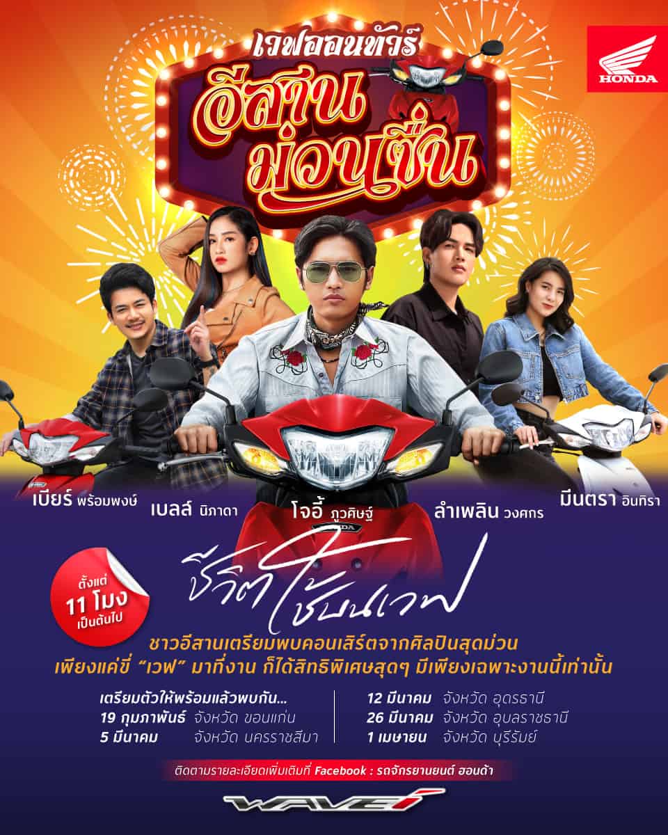 ไทยฮอนด้าพร้อมเปิดฉากความม่วนคักคักทั่วแดนอีสานกับงาน “เวฟออนทัวร์ อีสานม่วนซื่น” ที่จัดมาเพื่อครอบครัว Honda Wave รถจักรยานยนต์ฮอนด้ายอดนิยมอันดับหนึ่งของไทย กับหลากหลายกิจกรรม ไม่ว่าจะเป็นคอนเสิร์ตม่วนซื่นจากทัพศิลปินมาแรง และข้อเสนอพิเศษมากมาย ทั้งโปรโมชั่นพิเศษจองรถและเครื่องยนต์ฮอนด้าภายในงาน พร้อมแล้วที่จะไปเยือน 5 จังหวัด ทั่วแดนอีสาน ได้แก่ ขอนแก่น นครราชสีมา อุดรธานี อุบลราชธานี และบุรีรัมย์ เริ่มทัพความม่วนกันวันที่ 19 กุมภาพันธ์นี้ ที่บิ๊กซี สาขาบ้านแอนด์บียอนด์ จ. ขอนแก่น