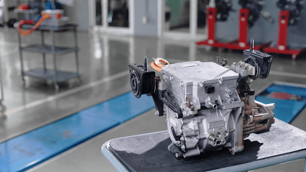 - มอเตอร์ไฟฟ้า (Drive Motor): ขุมพลังในการขับเคลื่อนรถยนต์ รับพลังงานไฟฟ้ามาจากแบตเตอรี่แรงดันสูง เพื่อขับเคลื่อนรถยนต์ โดยในอีกความสามารถที่สำคัญคือทำหน้าที่ผลิตกระแสไฟฟ้าป้อนกลับเข้าสู่แบตเตอรี่แรงดันสูงในขณะที่ชะลอความเร็วหรือลงเนิน โดยทั่วไปมอเตอร์ไฟฟ้านั้นมีขนาดที่ไม่ใหญ่มากตรงกันข้ามกับสมรรถนะที่ได้จากมอเตอร์ขับเคลื่อน ด้วยสาเหตุนี้ รถยนต์ไฟฟ้าจึงมีน้ำหนักรวมน้อยกว่ารถยนต์สันดาปที่มีสมรรถนะใกล้เคียงกัน จึงช่วยลดข้อจำกัดในการออกแบบรถยนต์และเพิ่มพื้นที่ใช้สอยในรถได้ ไม่ว่าจะเป็นการขยายให้มีพื้นที่ที่นั่งมากขึ้น หรือดีไซน์ให้ช่องใส่สัมภาระใหญ่ขึ้น